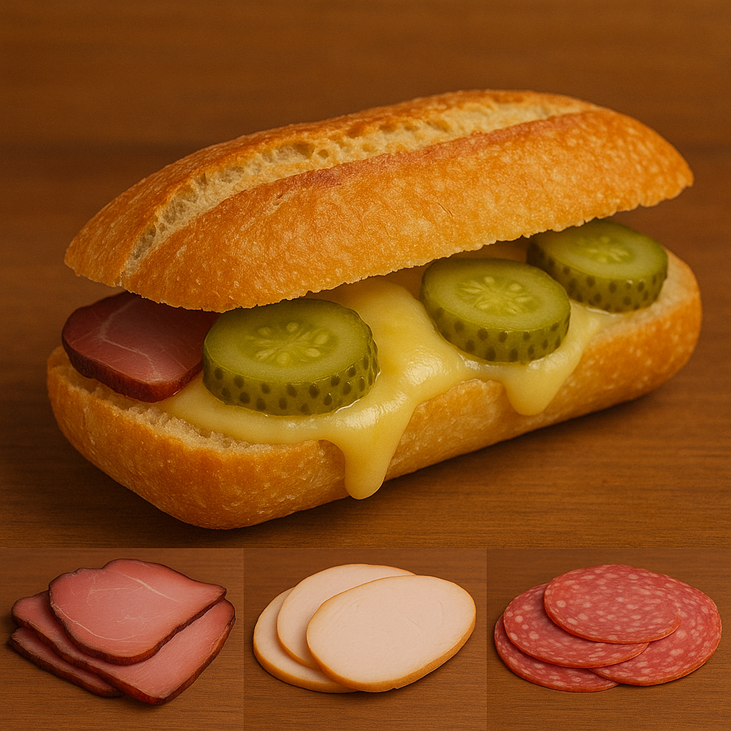 Un sandwich au fromage raclette avec une charcuterie au choix (jambon fumé, filet de poulet ou salami) et des cornichons !